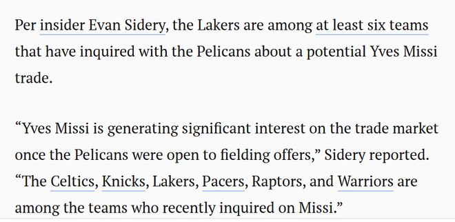 名记Sidery表示,湖人队是已向鹈鹕队询价米西的至少六支球队之一。