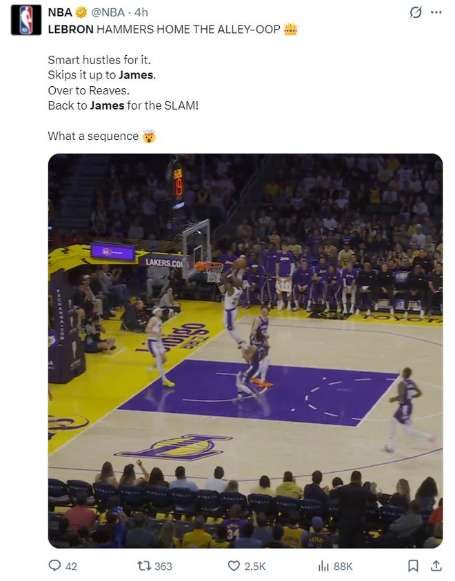 这场比赛41岁的勒布朗还完成了一个超级霸气的空中接力暴扣,NBA官方写道:勒布朗空接暴扣,霸气侧漏!戴上皇冠。