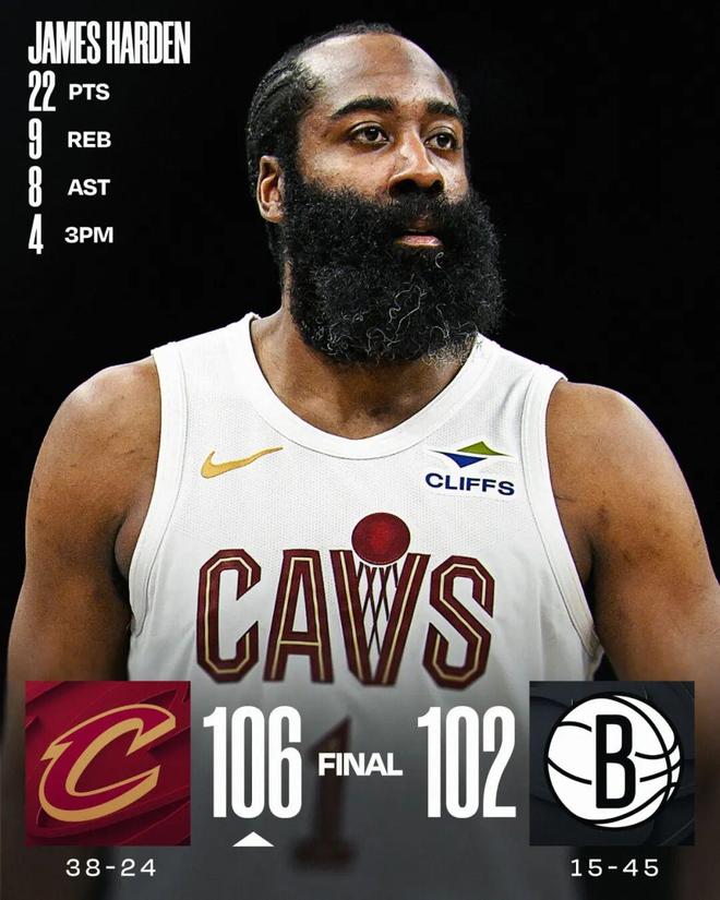 虽说对手是篮网,但本场骑士赢得并不容易,半场结束还以46-52落后,第三节哈登单节拿下12分4篮板2助攻,带队将分差追到1分;