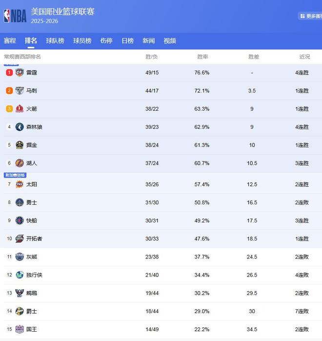 西部前2名的雷霆、马刺依旧优势很大,而且随着亚历山大复出,雷霆战绩也稳住了,本赛季2队大概率锁定前2!不过西部第3的位置,争夺非常激烈!